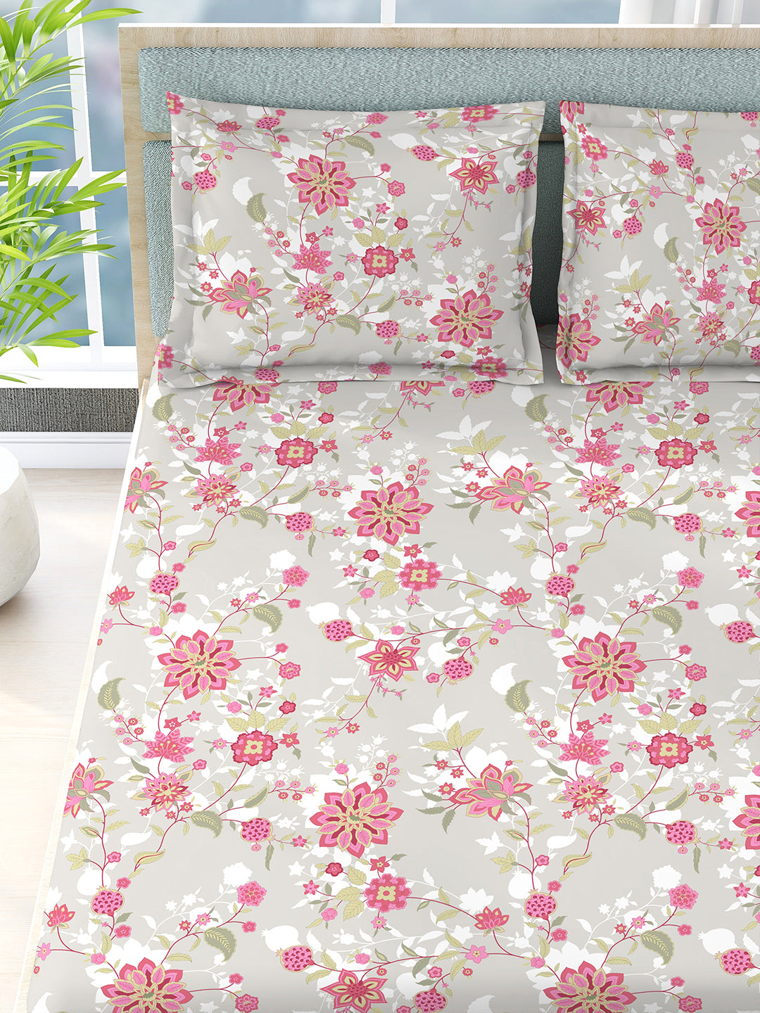 Siesta 100% Cotton 200 TC Pink & Grey Floral Print King Bedsheet with 2 Pillow Covers