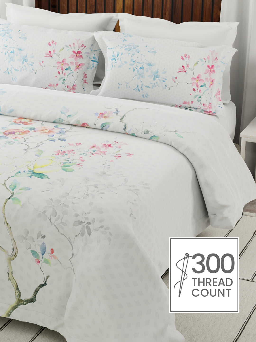 Gardenia Augusta 100% Cotton 300 TC White Floral Bedsheet with 2 Pillow Covers - Super King (120 L x 120 W inches)