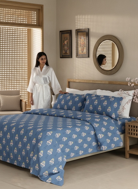 Indo Musk 100% Kasturi Cotton 200 TC Blue Floral King Bedsheet with 2 Pillow Covers
