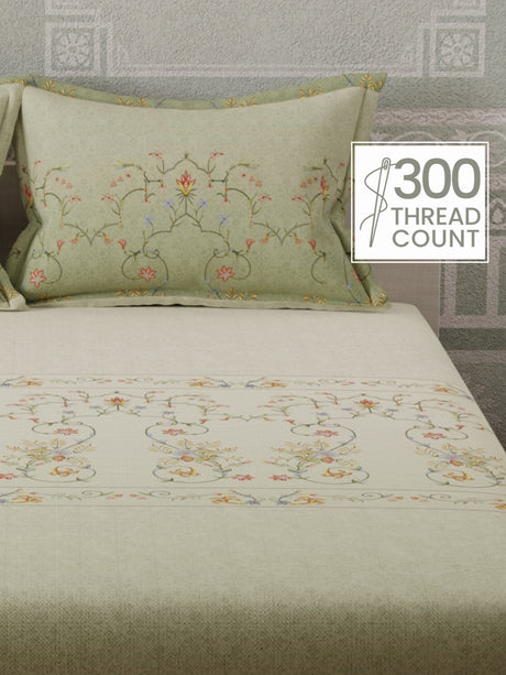 100% Cotton 200 TC, Beige Floral, King Size Fitted Sheet with 2 Pillow Covers - Valatia Collection