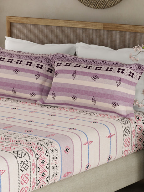 Valatia Gypsy 100% Cotton 200 TC Ethnic Print Fitted King Bedsheet with 2 Pillow Covers - Purple