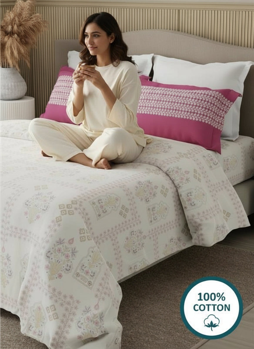 Valatia 100% Cotton 200 TC Karigari Printed Double Bedsheet with 2 Pillow Covers - Dark Pink & White